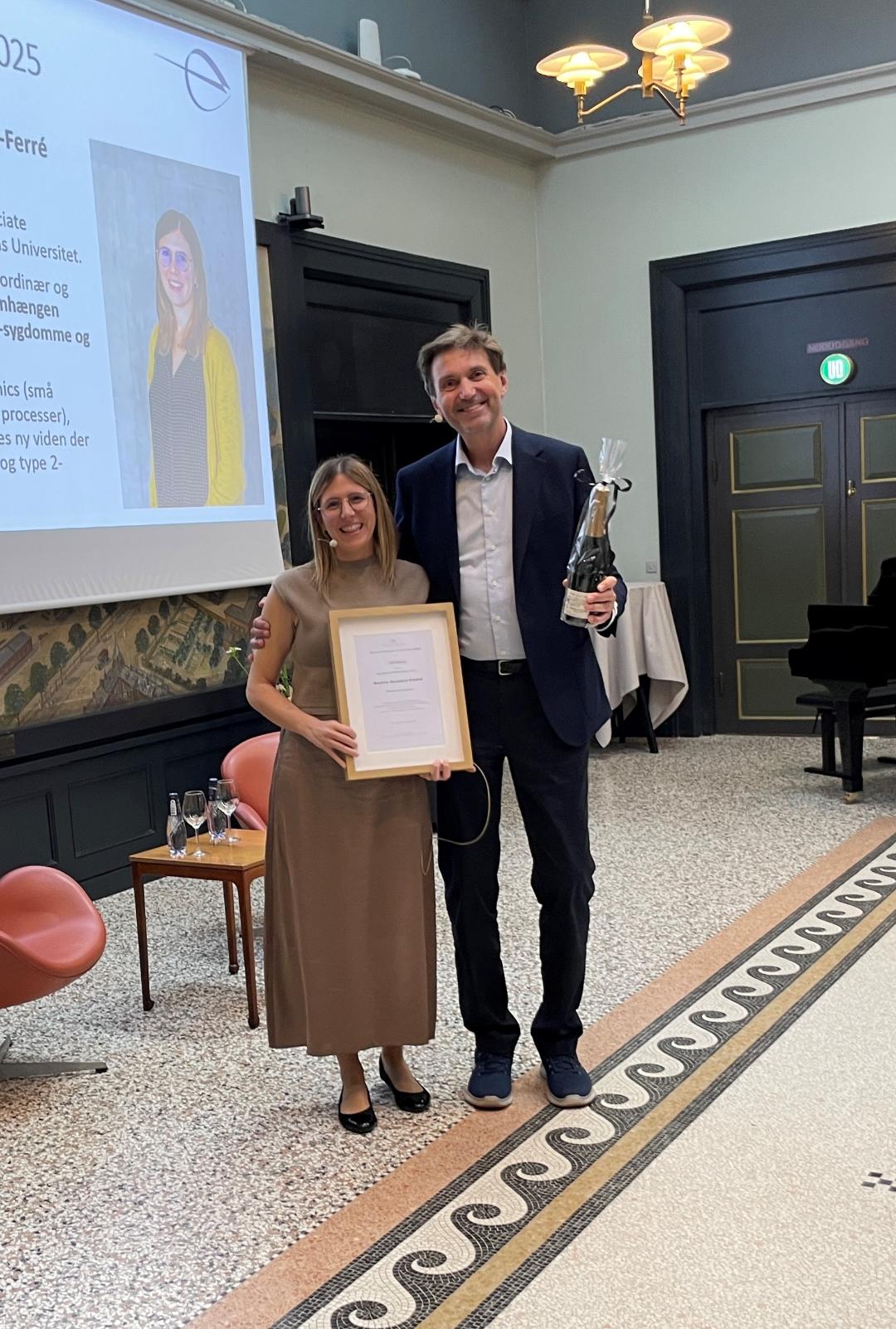 Bestyrelsesformand Oluf Borbye Pedersen lykønsker Professor Kamilla Miskowiak