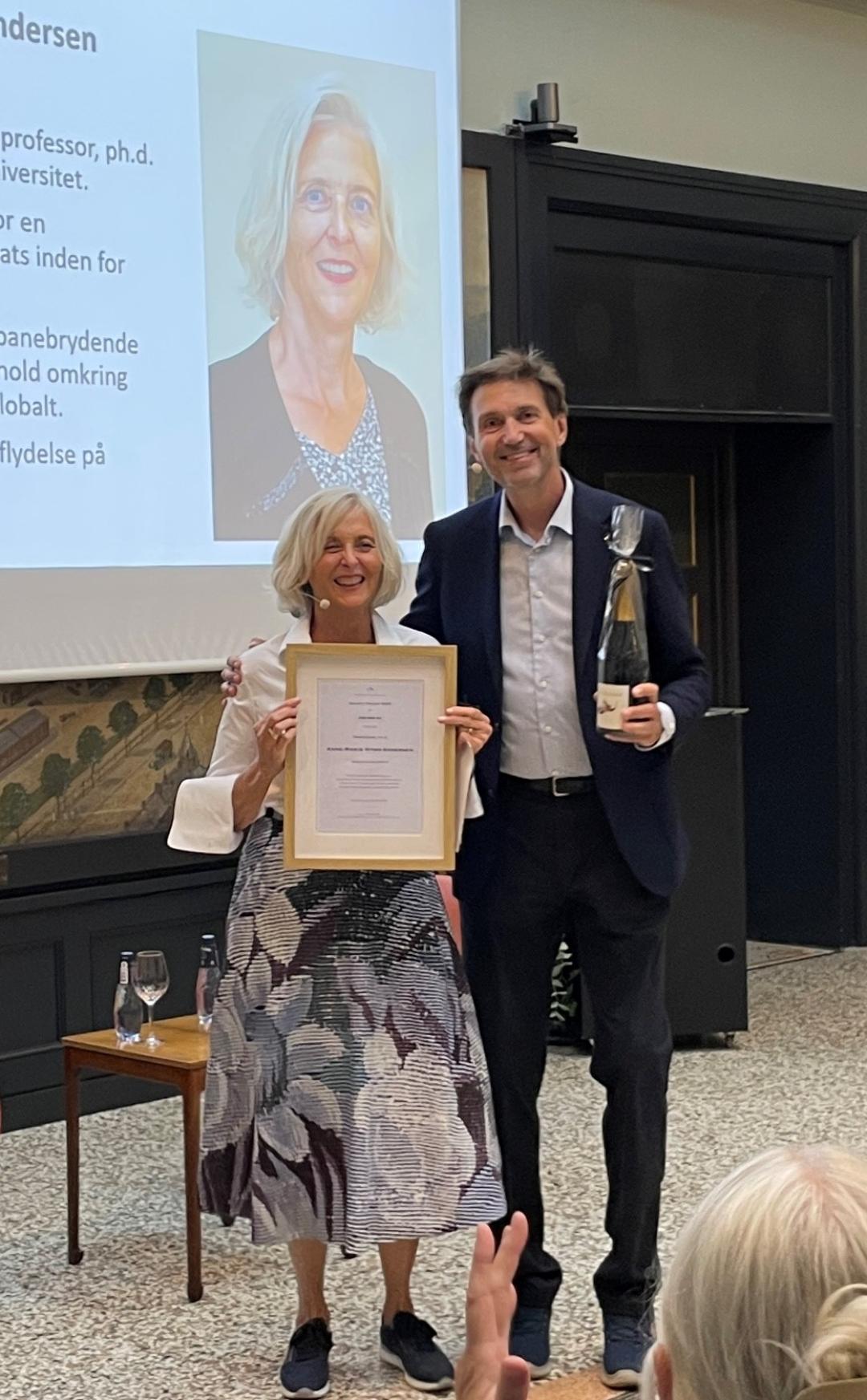 Bestyrelsesformand Oluf Borbye Pedersen lykønsker Professor Ulla Wewer